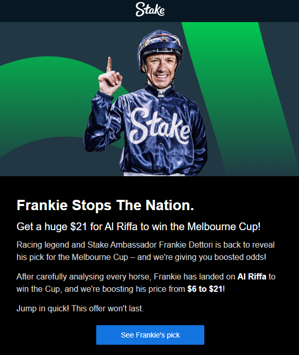 Now this is a great promo, because Stake is offering you a payout of 21 to 1 on a specific horse.